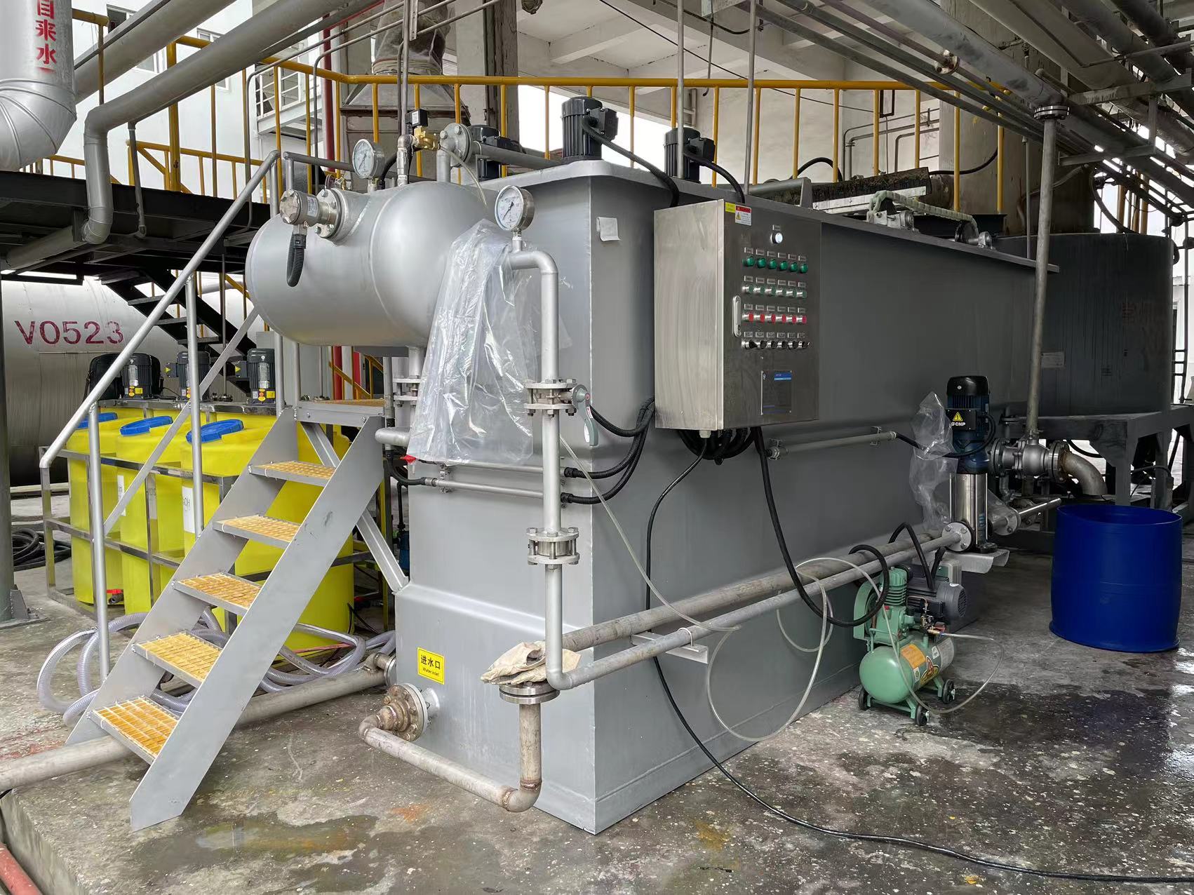 在生产PVC原材料的过程中排放的污水还含有少量PVC细小颗粒,将污水经过pH调节、混凝絮凝后,细小的颗粒汇聚成较大的絮状物,再使用气浮浮选出来进行回收。